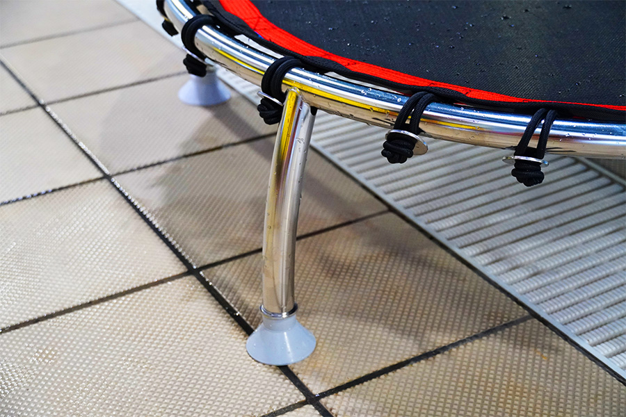 This aquatic trampoline is made of electropolished AISI-316L stainless steel, features a high-resistance jumping mat supported by 20 independent elastic bands, which are easy to replace, and leveling feet with suction cups that provide strong vacuum adhesion.
