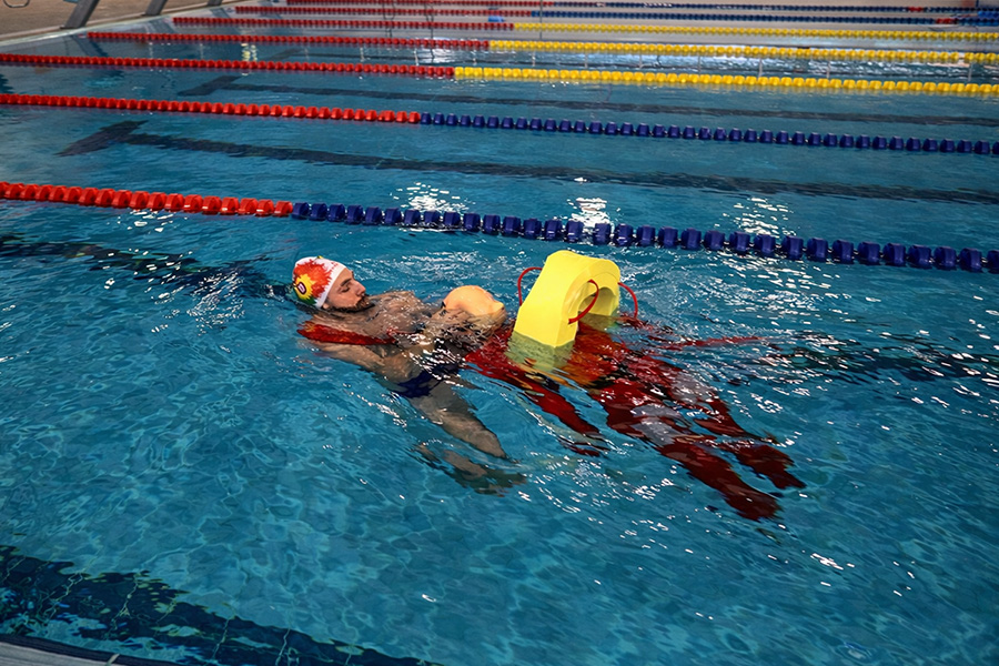 The Rescue Manikin measures 1.60m and weighs 30kg when dry. Its fabric allows it to dry quickly when removed from the water.