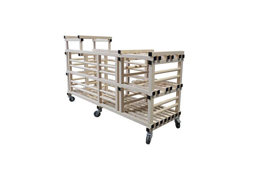 Este carro de arrumação é bastante versátil, pois possui quatro funções distintas: armário de cestos, jaula para arrumação de materiais diversos, armário de batatas fritas e suporte para cintos.